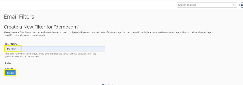Set Actions: After defining the rules, choose the action(s) you want the filter to take when an email matches those rules. Select from options such as “Discard Message,” “Redirect to Email Address,” “Forward to Email Address,” etc.