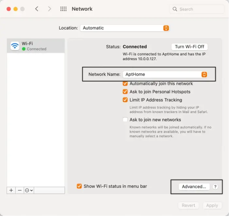 3. Click WiFi and select your Internet connection from the drop-down menu. Click Advanced.