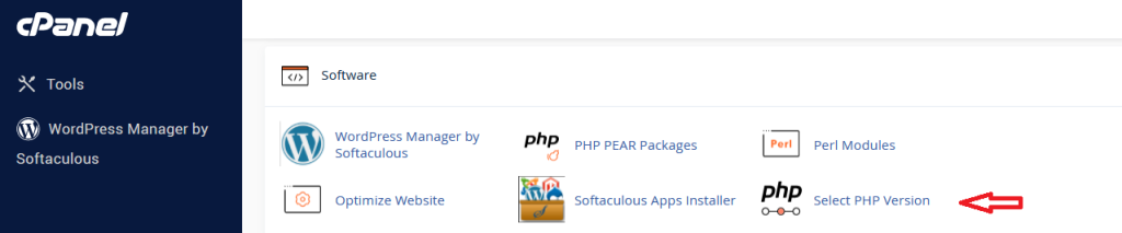 2. Scroll down and find Software and the Select PHP Version menu below.