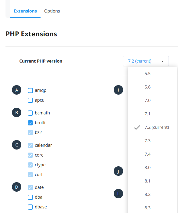 3. You can change the Required PHP versions under “PHP Extensions” Choose the required version as you required. The Current PHP Version is the default version for your web hosting account. You can change that by choosing one of the available PHP versions by just Clicking it.